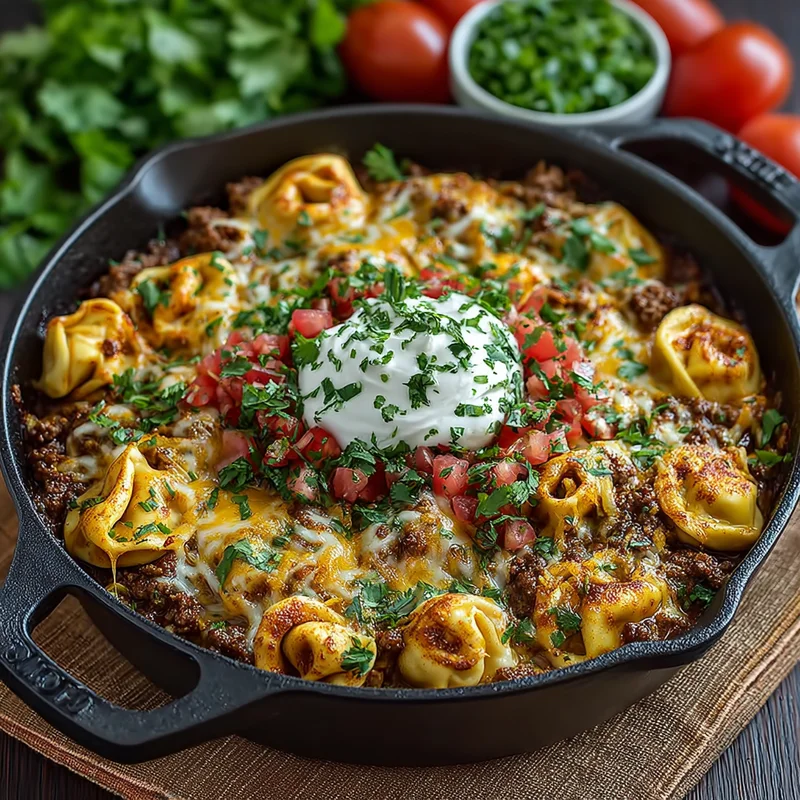 One-Pot Cheesy Enchilada Tortellini with Beef