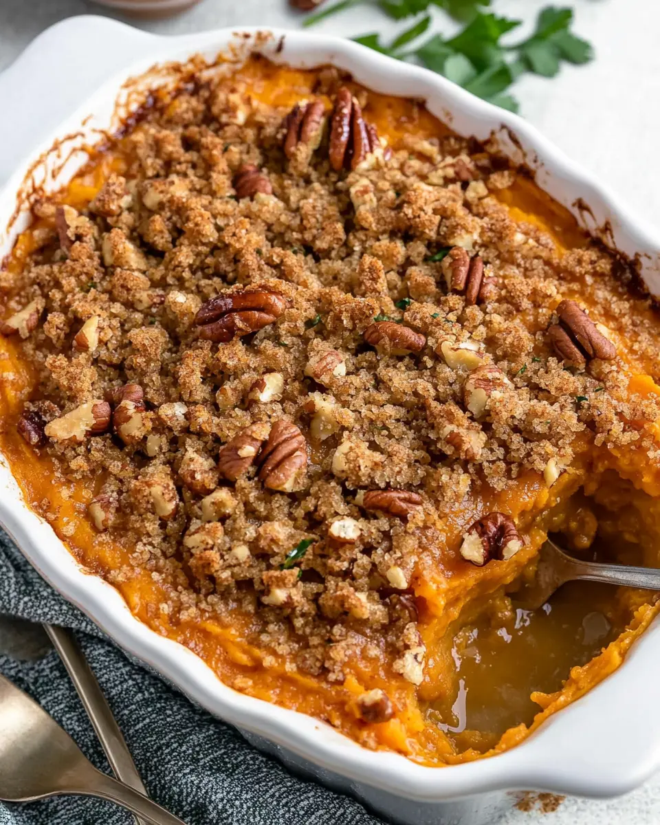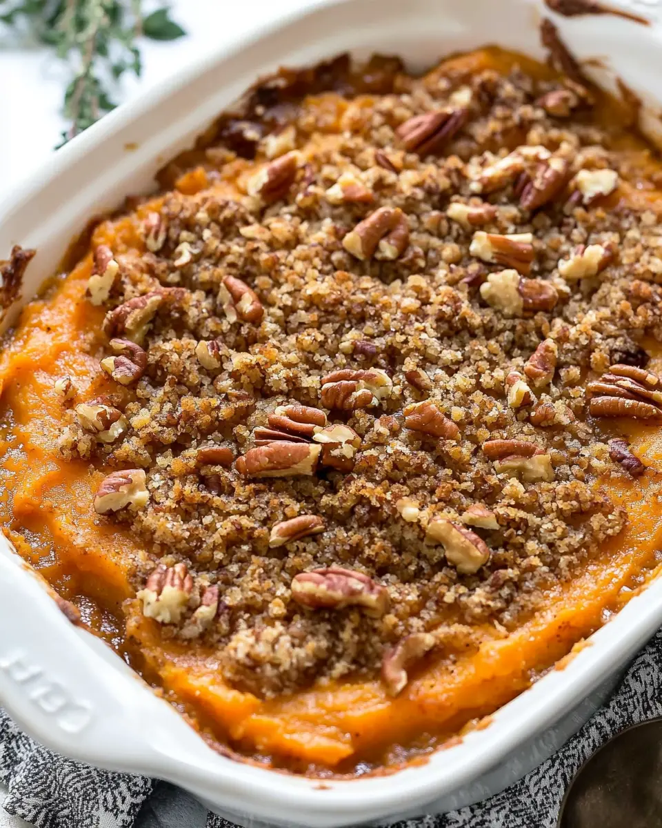 This delectable sweet potato casserole is a staple at holiday gatherings, featuring a sweet, buttery topping that elevates the dish.