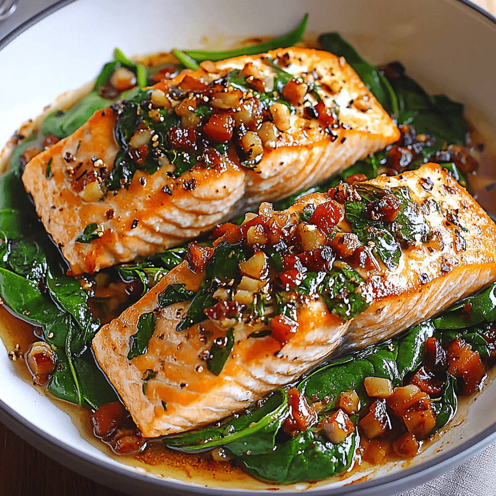 - Combine and Serve: Once the spinach is cooked, season it with salt, pepper, and a squeeze of lemon juice. Transfer the cooked salmon to a serving plate. Top with the sautéed spinach. Garnish with fresh dill or parsley, if desired. Serve immediately.
