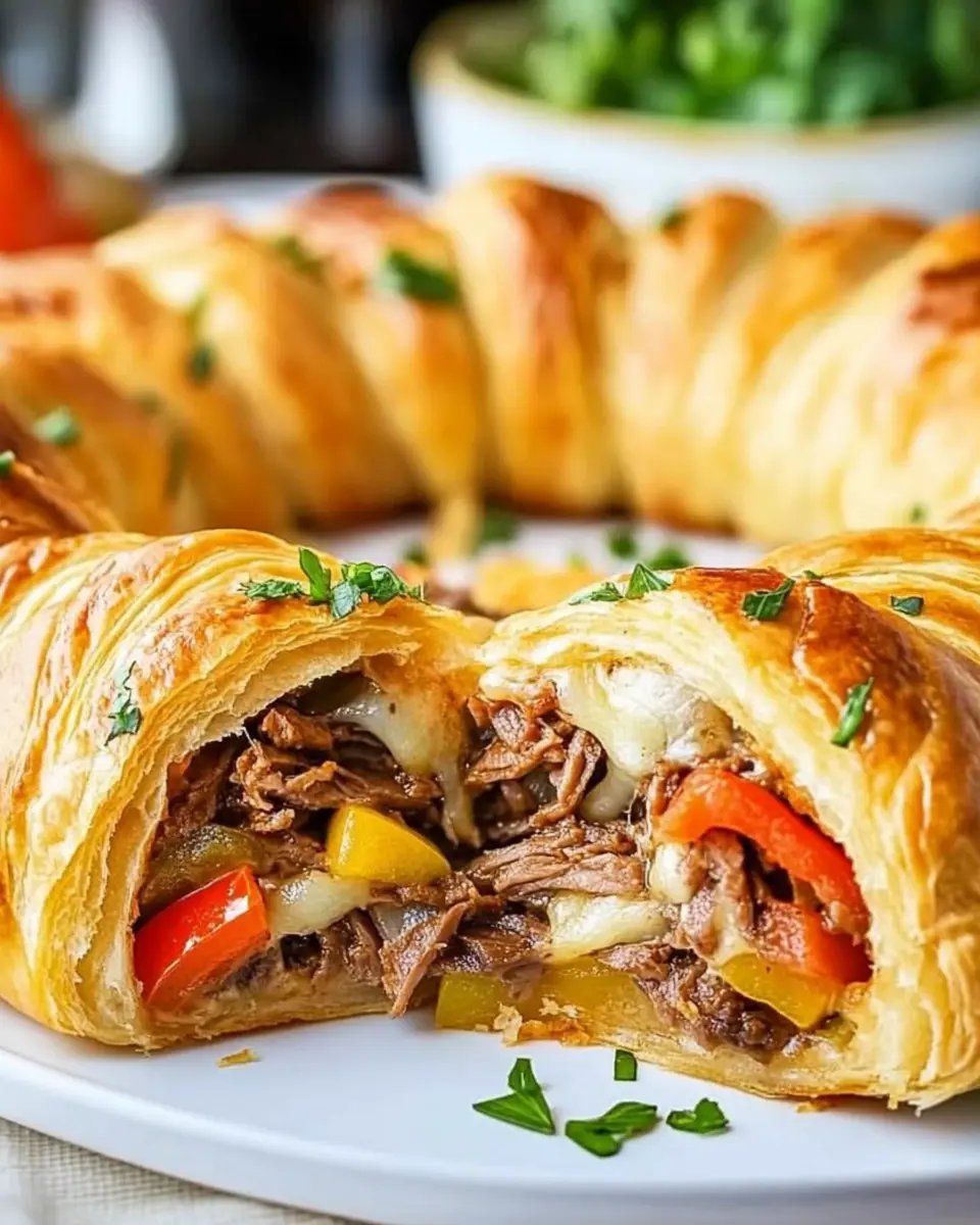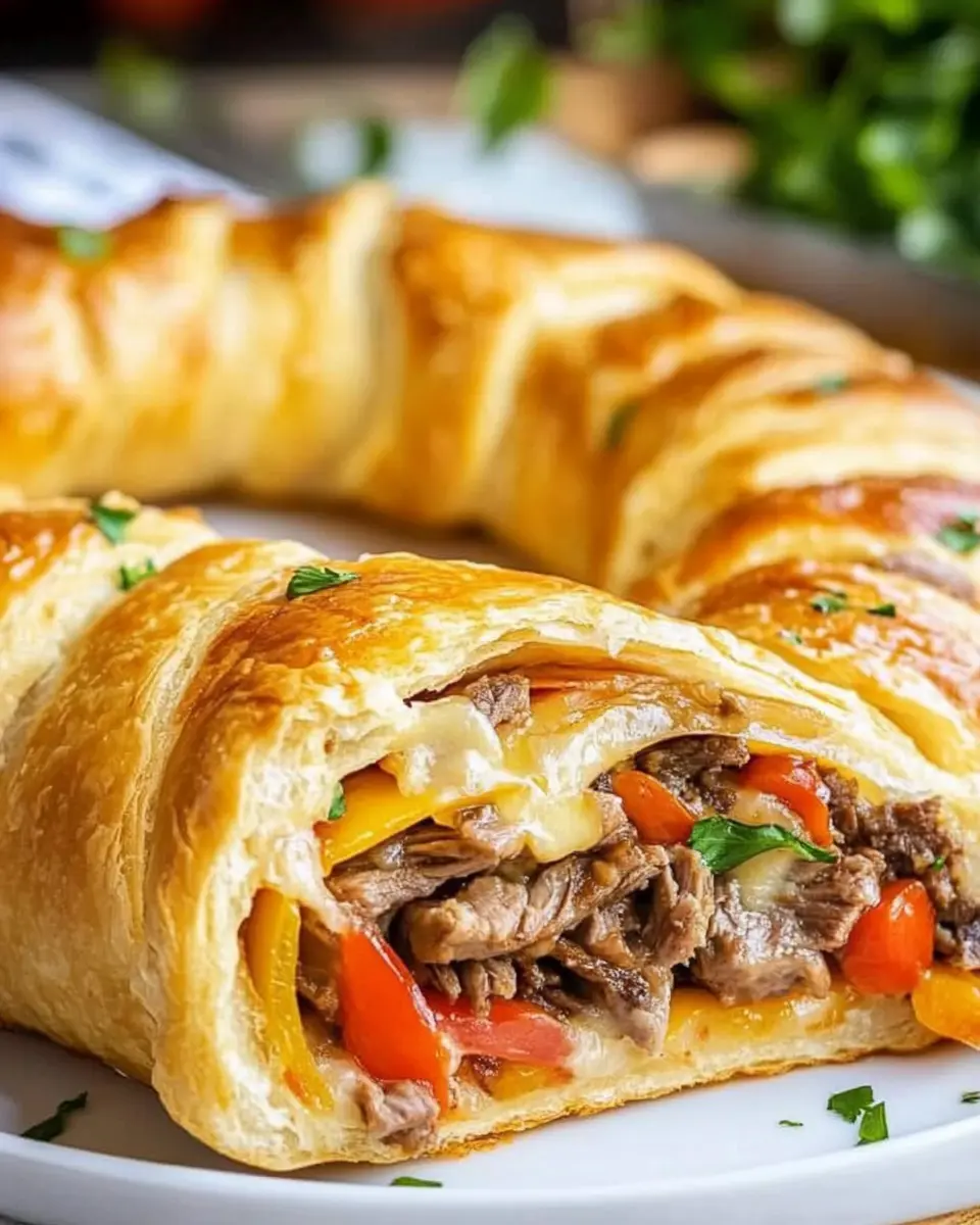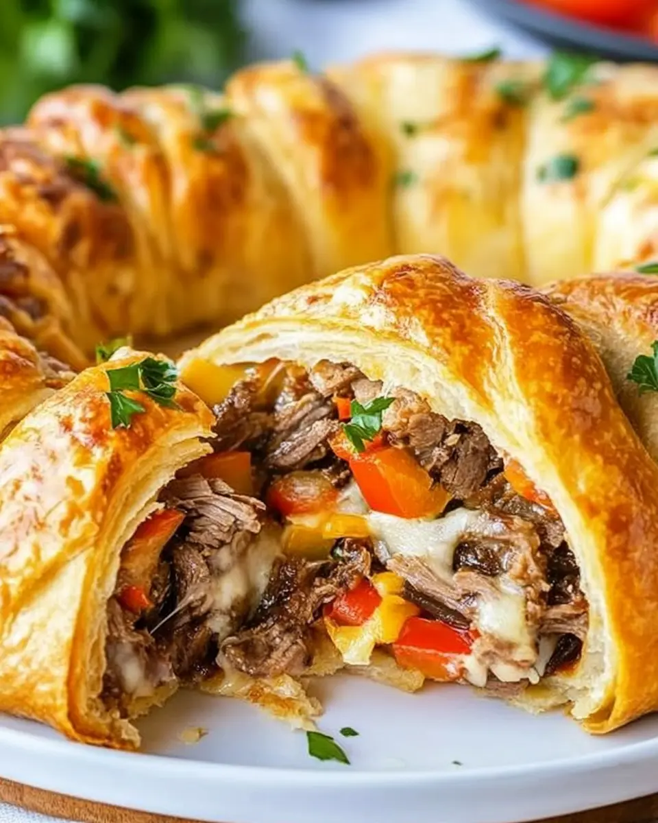 This Philly Cheesesteak Crescent Ring is a delicious twist on the traditional cheesesteak, made with tender beef, melted cheese, and flaky crescent dough.