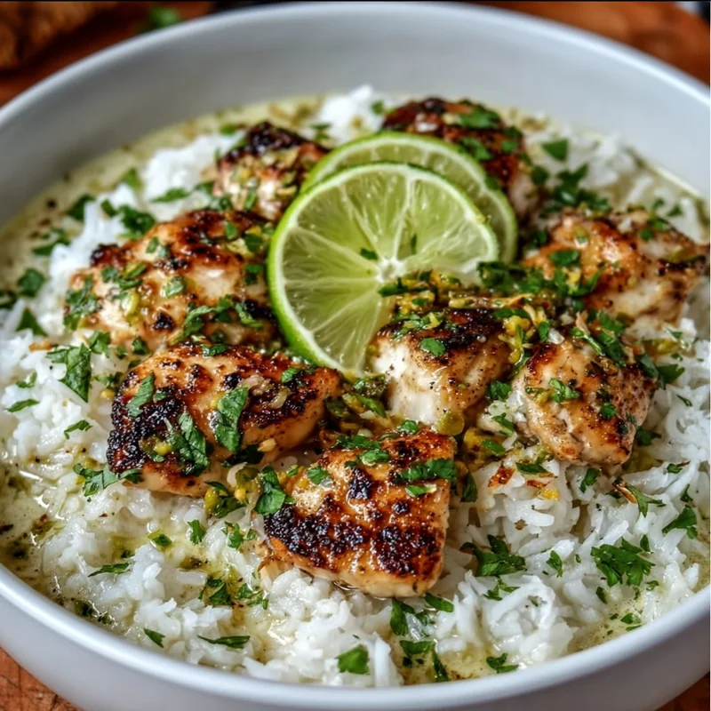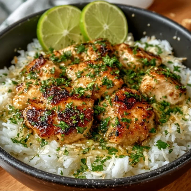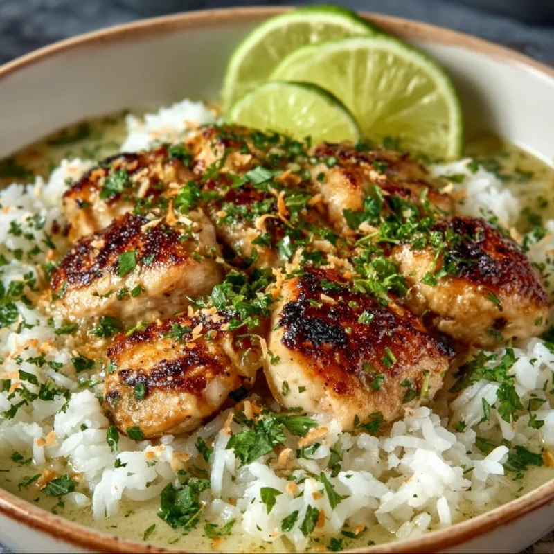 - Serve and Enjoy! Spoon the fluffy rice onto plates or into bowls. Top with a succulent chicken breast and plenty of that delicious coconut sauce. Sprinkle with toasted coconut for a delightful crunch and serve with those lime wedges on the side for an extra squeeze of flavor.