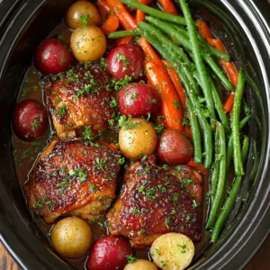 A: If you’d like a thicker sauce, you can remove the chicken and vegetables towards the end of cooking, turn the slow cooker to high, and let the sauce reduce uncovered for about 20-30 minutes. Alternatively, you can mix a tablespoon of cornstarch with a tablespoon of cold water to create a slurry, then stir it into the sauce and let it simmer until thickened.