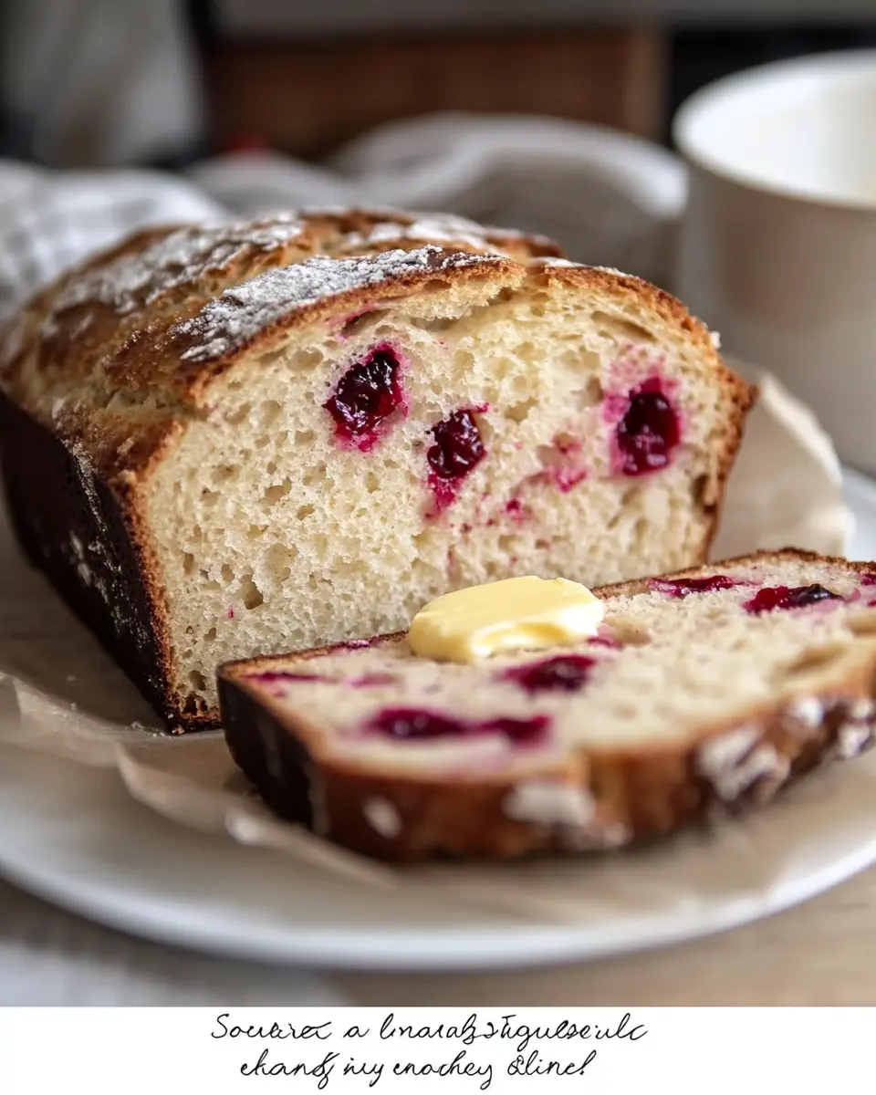 A delightful and tangy sourdough bread studded with tart cranberries, perfect for toasting or enjoying on its own.