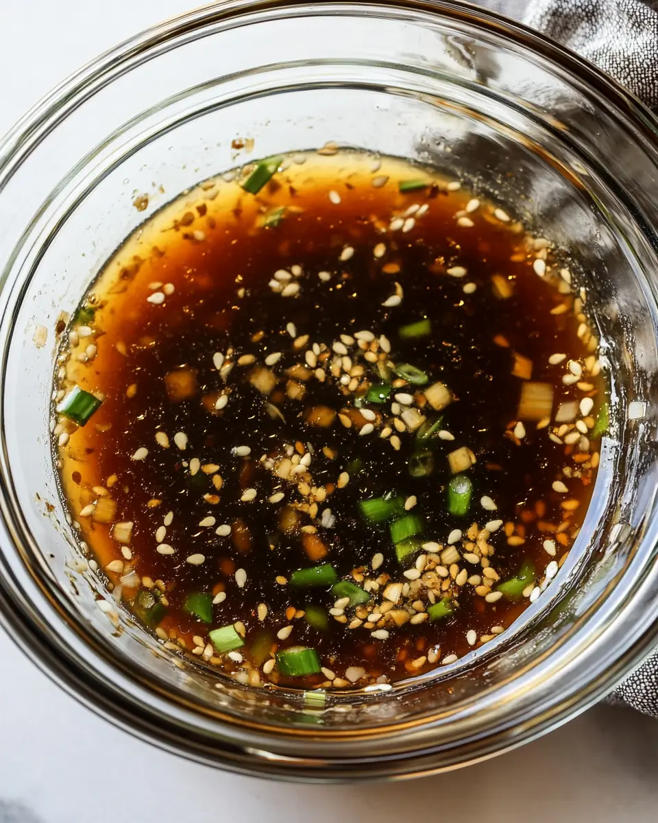 - In a bowl, mix soy sauce, rice vinegar, fresh ginger, garlic, sesame oil, and maple syrup until combined.
