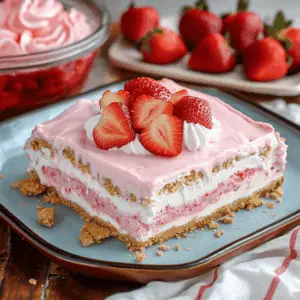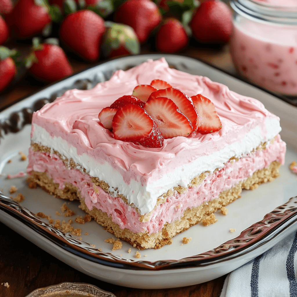 What sets this cake apart? It’s the perfect balance of flavors and textures. The tangy cheesecake pudding provides a creamy richness that complements the sweetness of the strawberries and frosting beautifully. The graham cracker crust adds a delightful crunch that keeps each bite interesting. And let’s be honest, who doesn’t love the convenience of using store-bought frosting? It allows you to focus on assembling this stunning dessert without sacrificing any of the deliciousness.