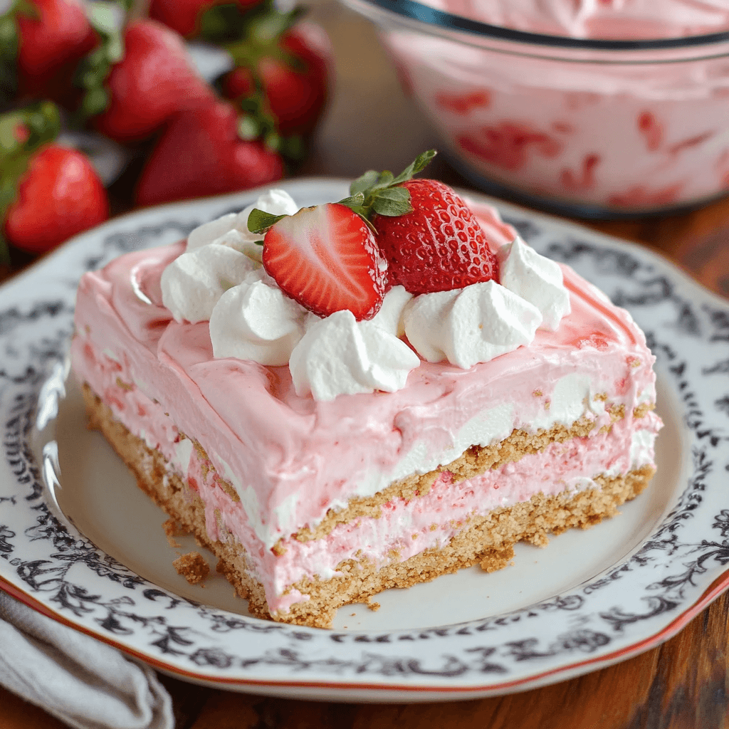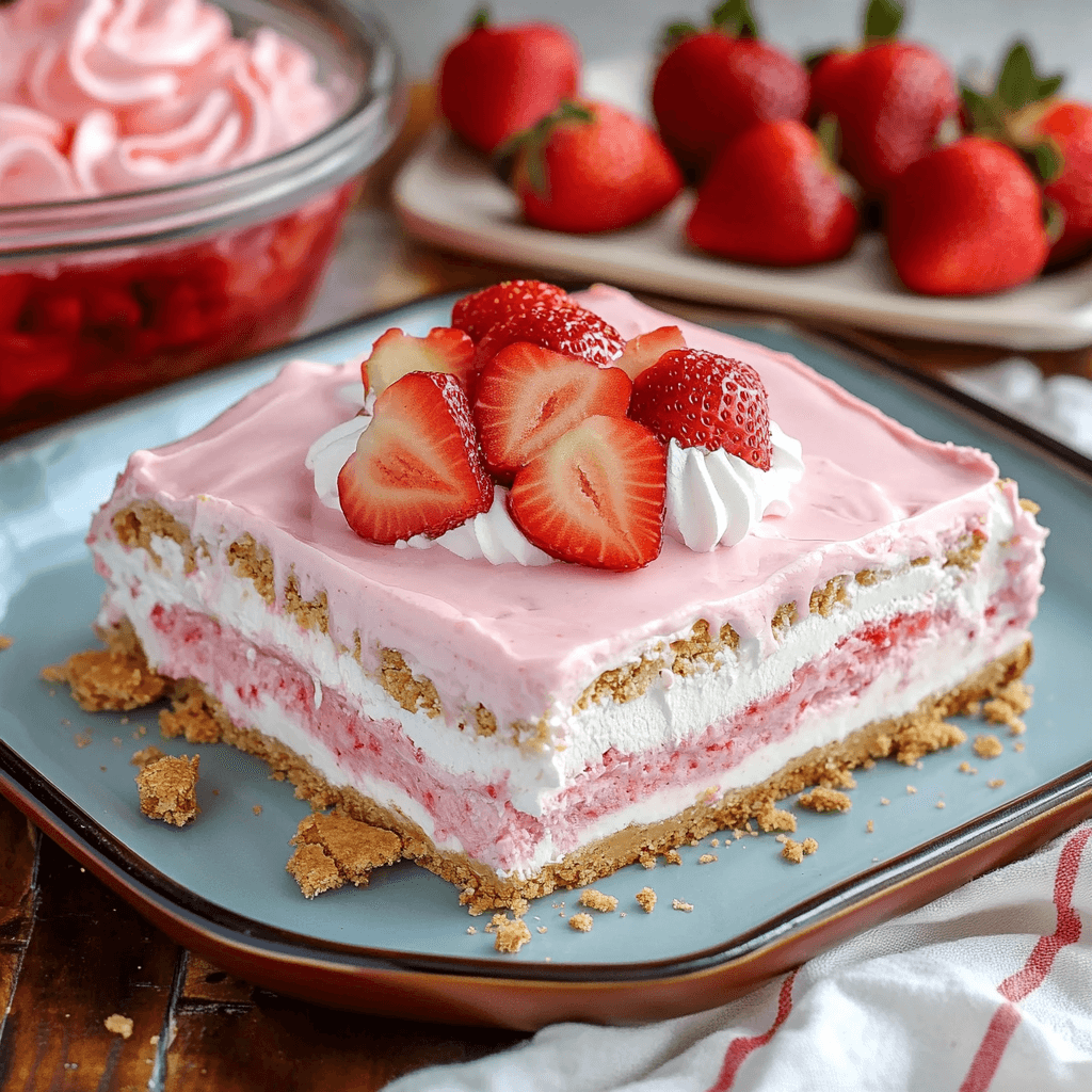 - Assemble the Cake: In a 9×13 inch baking dish, spread half of the crushed graham crackers evenly. Top with half of the strawberry pudding mixture. Arrange half of the sliced strawberries over the pudding. Repeat the layers: remaining graham cracker crumbs, remaining pudding, and remaining strawberries.