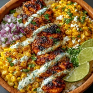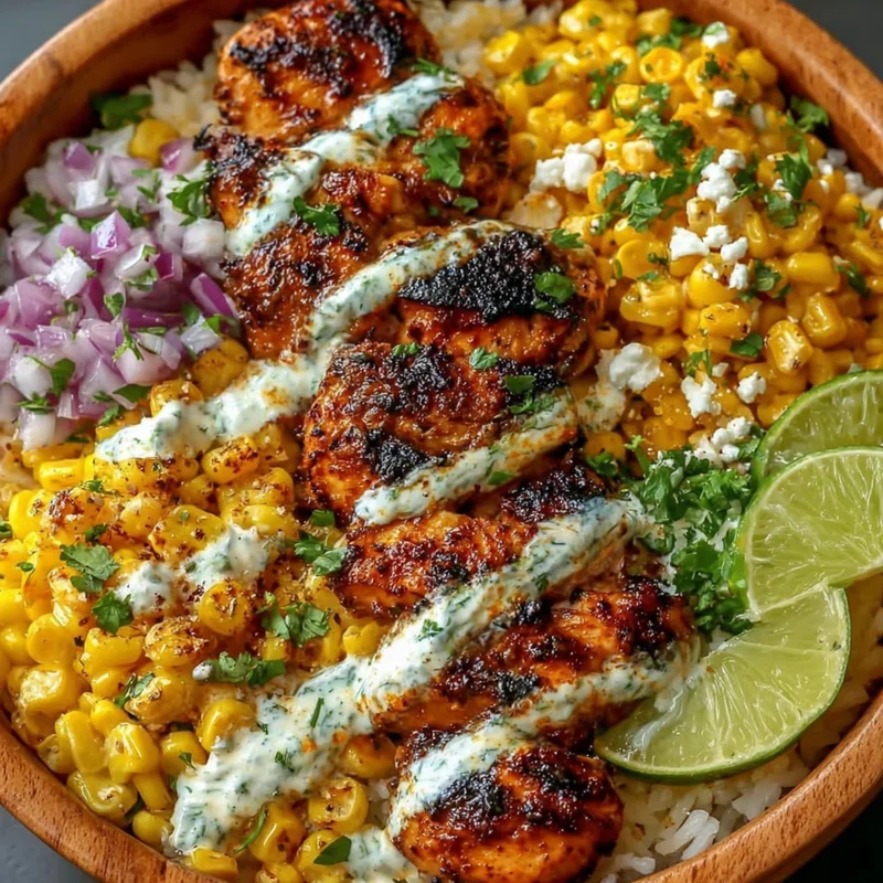 - Spoon a generous amount of the street corn topping over the chicken in each bowl. Garnish with additional chopped cilantro, sour cream, and Cotija cheese if desired. Serve immediately with fresh lime wedges on the side.