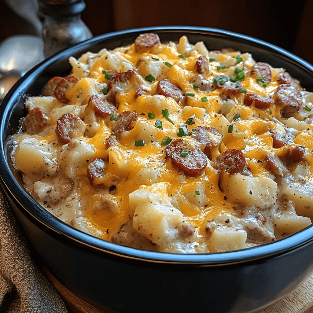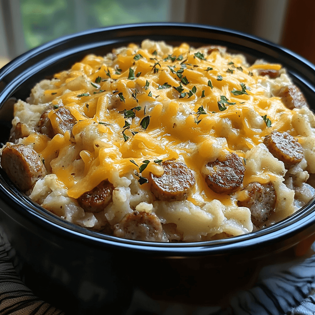 Super Easy Cheesy Sausage Hashbrown Slow Cooker Meal