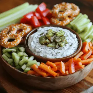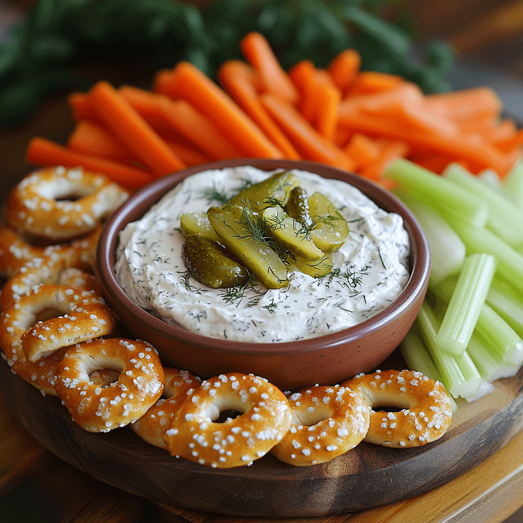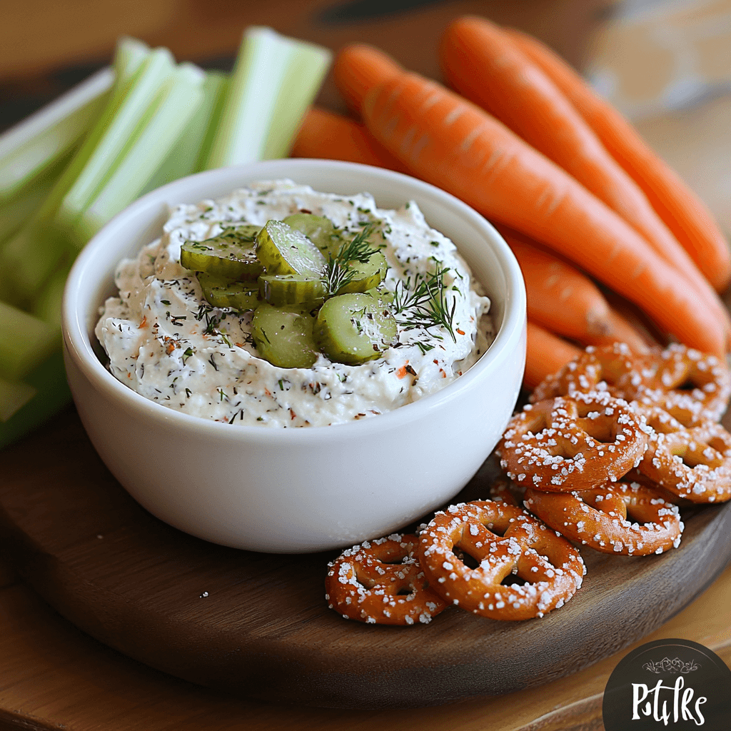 Spicy Pickle Dip: Add a pinch of cayenne pepper or a few dashes of your favorite hot sauce to the dip for a kick. Creamy Dill Pickle Dip with Ranch: Mix in a few tablespoons of your favorite ranch dressing. Bacon Pickle Dip: Crumble some cooked bacon on top of the dip for a smoky, salty flavor. Vegetarian Version: This recipe is naturally vegetarian. Gluten-Free Option: Ensure the pretzels used are gluten-free. For a truly low-carb option, skip the pretzels entirely and focus on the fresh vegetable dippers.