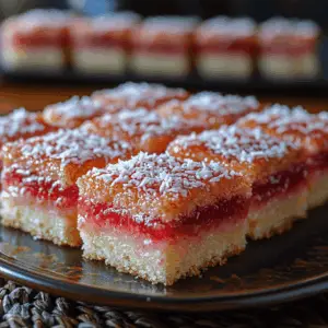Delicious squares with a buttery shortbread base, a sweet strawberry layer, and a creamy coconut topping.